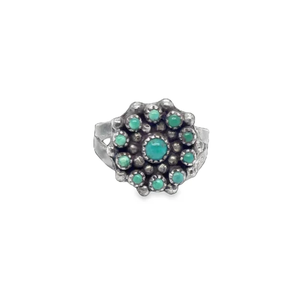 This handmade 1970s turquoise cluster ring features a stunning “snake eye” floral arrangement of vibrant turquoise cabochons. Expertly crafted in solid sterling silver with a substantial weight of 2.7 dwt, each stone boasts a unique, natural patina that collectors crave. This mid-century treasure offers a one-of-a-kind aesthetic that showcases traditional Southwestern artistry and timeless style. Perfectly sized at 7.75, this wearable heirloom is a high-quality investment and a breathtaking statement piece for any vintage collection.