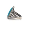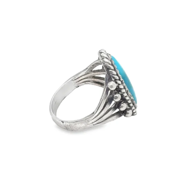 This vintage 1970s Navajo-style pointer ring is a stunning example of Southwestern craftsmanship. Featuring an elongated, vibrant blue turquoise cabochon set in a classic serrated bezel, the stone is beautifully framed by a traditional twisted wire rope border. Handcrafted in 925 sterling silver, the mounting is adorned with intricate silver beads and openwork split-shank detailing, giving it a bold yet elegant silhouette. It features an elongated, oval turquoise gemstone—possibly Sleeping Beauty or Kingman turquoise.