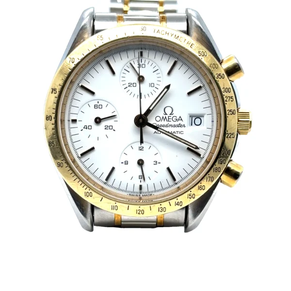 Brand: Omega Model Name: Omega Speedmaster Automatic Reduced Gold and Stainless Steel Model Number: ST175.0043 Gender: Men’s Key Features: Reference ST175.0043 Produced between 1992 and 1998, the Omega Speedmaster ST175.0043 is part of a limited production series known for its refined design and automatic movement. Powered by Omega’s mechanical automatic movement (Caliber 1155/1152), ensuring reliable and precise timekeeping. Case material is stainless steel with a solid gold bezel, providing a perfect blend of durability and luxury. 39mm case diameter, offering a classic size that suits any wrist, whether for formal or casual wear. Press-in case design adds to the authentic, vintage appeal of this timepiece. White (.600) dial featuring 3 chronograph counters, luminous hour markers, and luminous hands for enhanced visibility, making it easy to read in any lighting. Water-resistant up to 5 bar (50 meters / 167 feet), perfect for everyday wear and light water activities. Automatic mechanical movement (Caliber 1155/1152), known for its precision and craftsmanship. 18K yellow gold tachymeter bezel adds sophistication and functionality. Scratch-resistant sapphire crystal protects the dial for long-lasting clarity. Three chronograph subdials: small seconds, 30-minute recorder, and 12-hour recorder, with a date window at the 3 o’clock position. The Omega Speedmaster comes fitted with a New Old Stock (NOS) genuine Omega stainless and gold bracelet, maintaining the watch’s authenticity and pristine condition. The bracelet is full-sized, ensuring a perfect fit for any wrist size. Excellent condition, this Omega Speedmaster has been well-maintained with no visible engravings, making it ready for immediate wear. Our technicians have completely serviced this timepiece ensuring it is fully functional and running at optimal performance. (We use only Omega parts.) Includes a 1-year limited warranty for peace of mind. Certified authentic.