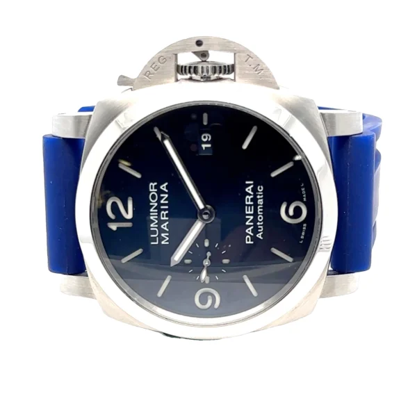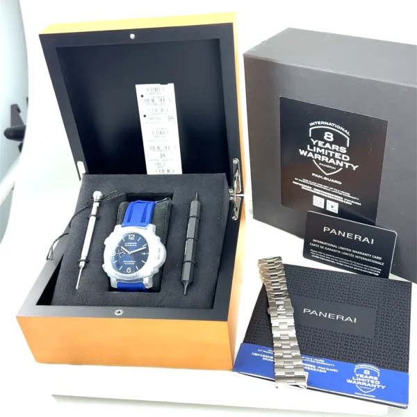 Panerai Luminor Marina PAM 01316 Basic Info Brand: Panerai Model: Luminor Marina Reference number: PAM 01316 Movement: Automatic Case material: Steel Bracelet material: Leather, Steel Year of production: 2021-2025 Gender: Men’s watch/Unisex Movement: Automatic Caliber/movement: P.9010 Case material: Steel Case diameter: 44.0 mm Water resistance: 30 ATM Crystal: Sapphire crystal Dial: Blue Bracelet material: Steel (unworn and comes with) Currently fitted with a beautiful blue rubber strap with a stainless buckle by Horus Comes with display box, paperwork, tools, tags, outer box, bracelet (and the blue rubber strap), rubber case protector – everything shown in the photos comes with the watch. In absolutely pristine condition. Serial number: OP739BB202XXXX