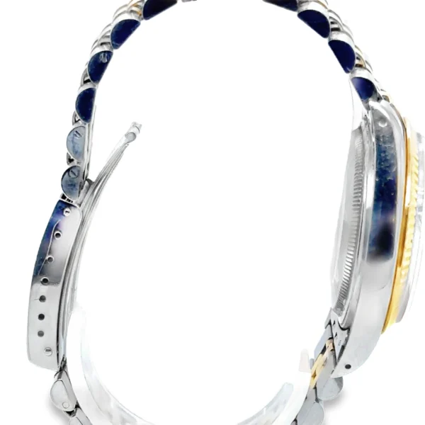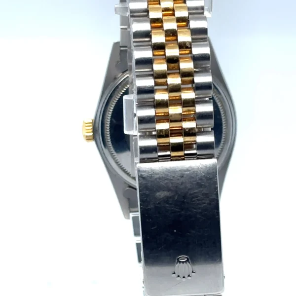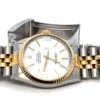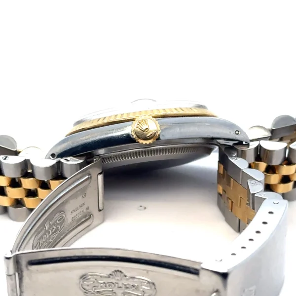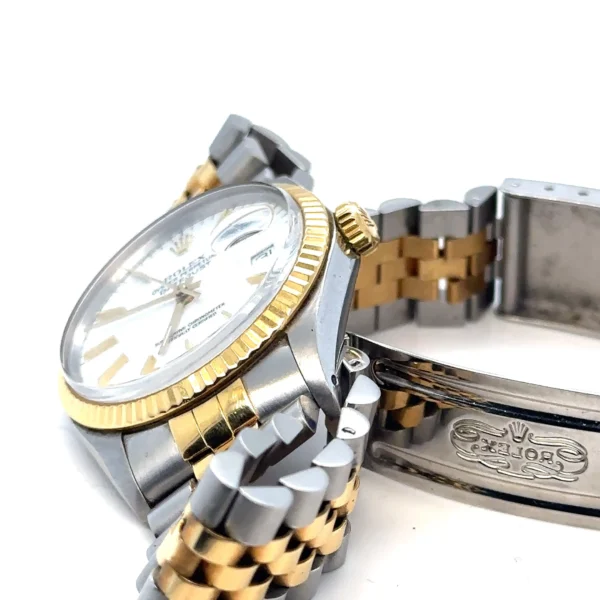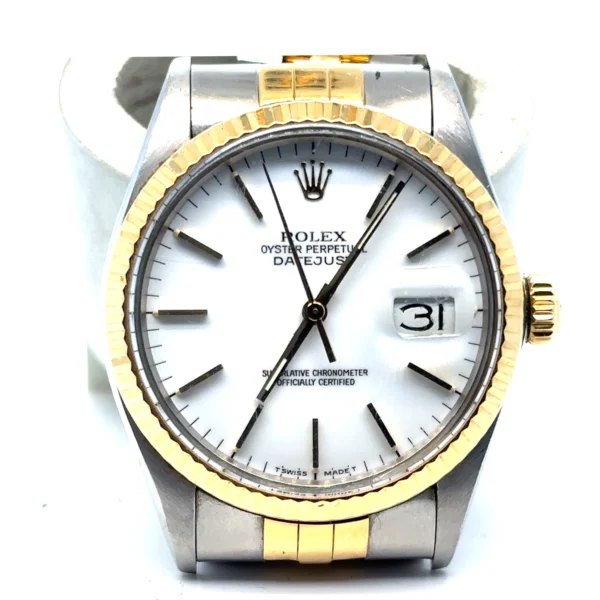 This 1986 Rolex Datejust 16013 is a collector’s find, combining vintage soul with modern convenience. Featuring the quickset Caliber 3035 movement, this example stands out with a crisp, original white dial paired with classic gold baton markers and hands. The highlights include complete provenance with the highly sought-after original Rolex paperwork and a 36mm stainless steel and 18k yellow gold case with a sharp fluted bezel and features a clean white index dial, an elegant alternative to the more common champagne face. Fitted with the Jubilee bracelet with all links included, which shows honest, age-appropriate wear. Solid, wearable condition. This is a period-correct piece from 1986, featuring the vintage-spec armored acrylic crystal.