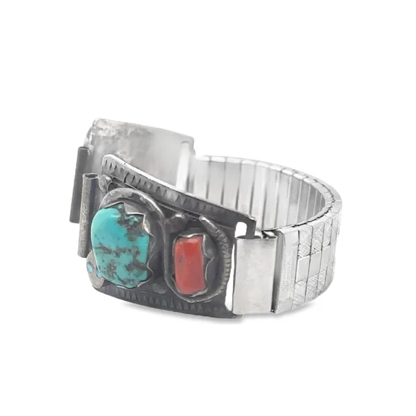 Sterling Silver, Turquoise, Coral & Snake Motif Watch Bracelet by Effie Calavaza – Zuni Pueblo, NM