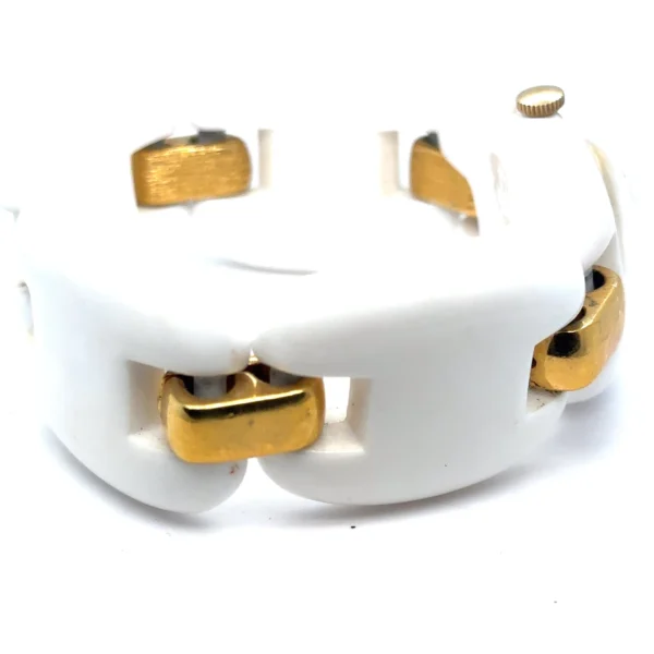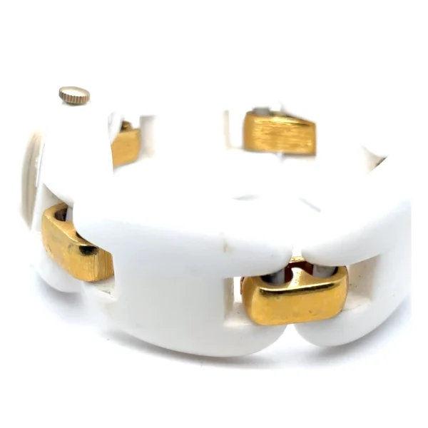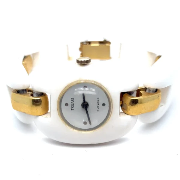 This signed vintage Trifari MOD watch captures the bold plastic-and-gold aesthetic of the 1960s–1970s and makes an excellent addition to any vintage watch collection, mid-century modern collection, or designer costume jewelry archive.