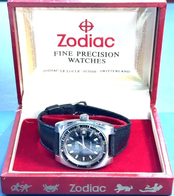 Housed in the quintessential stainless steel cushion case, this timepiece represents the peak of 1970s Swiss functional design. The legendary vibrant orange seconds hand remains the focal point, ensuring instant legibility while providing that unmistakable Zodiac character. To complete the “stealth” look, we have paired this glossy dial variant with a premium black NATO fabric strap, creating a seamless, monochromatic appearance that emphasizes the watch’s rugged yet refined silhouette.