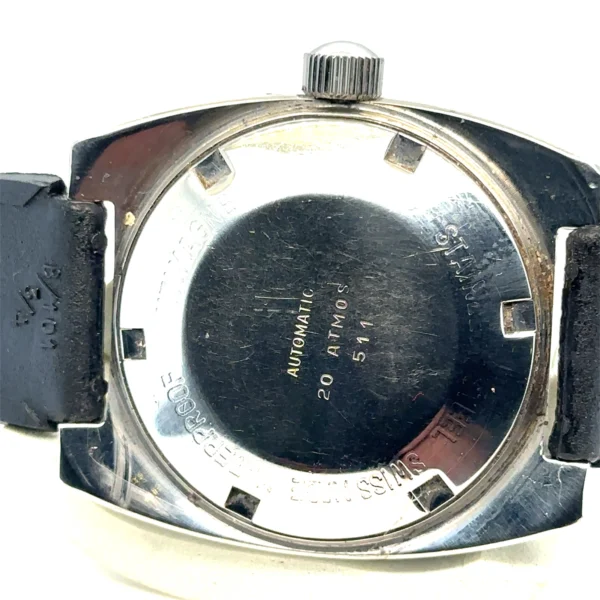 This professional-grade timepiece is branded by Zodiac as part of their legendary Sea Wolf Automatic line. Dating back to the 1970s, it features an original Swiss-made automatic self-winding movement that winds, sets, and runs strongly, ensuring it is ready for daily wear. The movement is housed in a 38mm stainless steel cushion-shaped tonneau case. The standout feature is the rare glossy black dial adorned with high-contrast applied block indices and the original baton handset with the iconic orange sweep seconds hand. The watch is equipped with a bidirectional rotating diver’s bezel with a 60-minute scale and a high-domed acrylic crystal for an authentic vintage profile. It comes fitted with a brand-new, heavy-duty black NATO fabric strap.