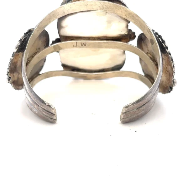 This bracelet is adjustable to fit almost any wrist and is crafted from sterling silver, Morenci turquoise, and genuine bear claws. It is hallmarked JW, representing Juliana Williams, a highly regarded Navajo (Diné) artist. Expertly made, this piece weighs 58.8 pennyweight and measures 2½ inches at its widest point and ¾ inch at its narrowest. Although created in the mid-to-late 1970s, it looks brand new and would make a stunning addition to any collection, perfect for wearing or displaying.