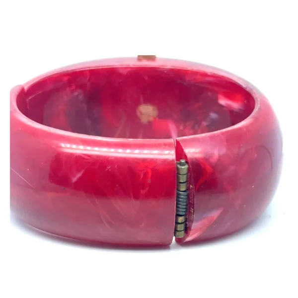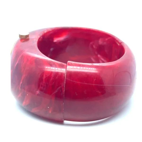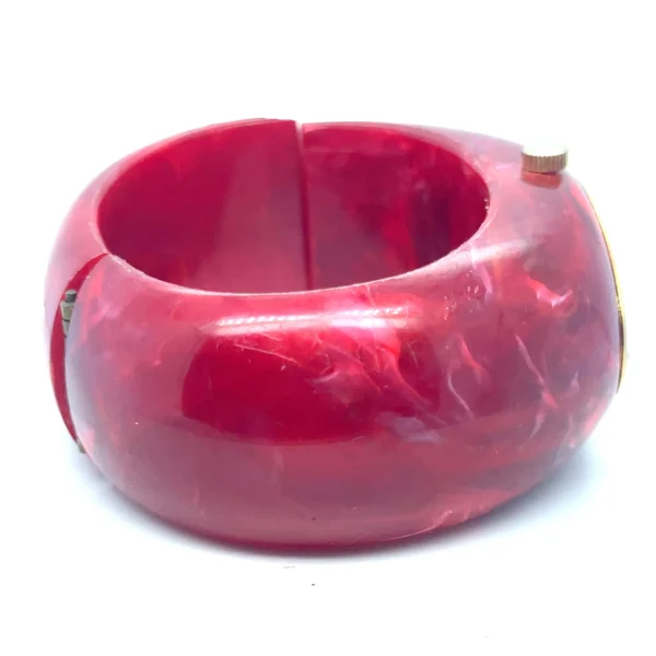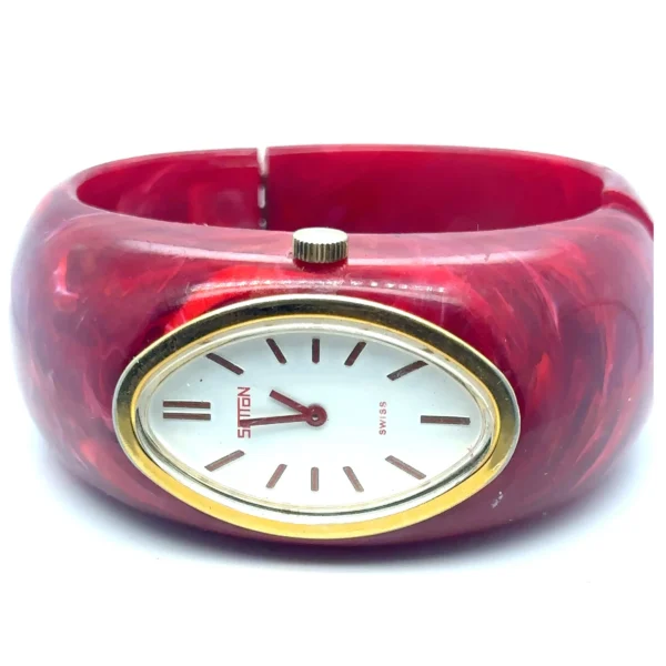The chunky marbled red bracelet is crafted from period Lucite or Bakelite-style acrylic and features the classic spring-loaded clamper (bangle cuff) design that wraps securely around the wrist without a traditional clasp. A true statement piece with authentic 1960s–70s retro appeal, perfect for collectors and vintage fashion enthusiasts. Vintage Sutton clamper watches in good, working condition typically sell for between $70 and $125 on the vintage market. Sold as-is without warranty.